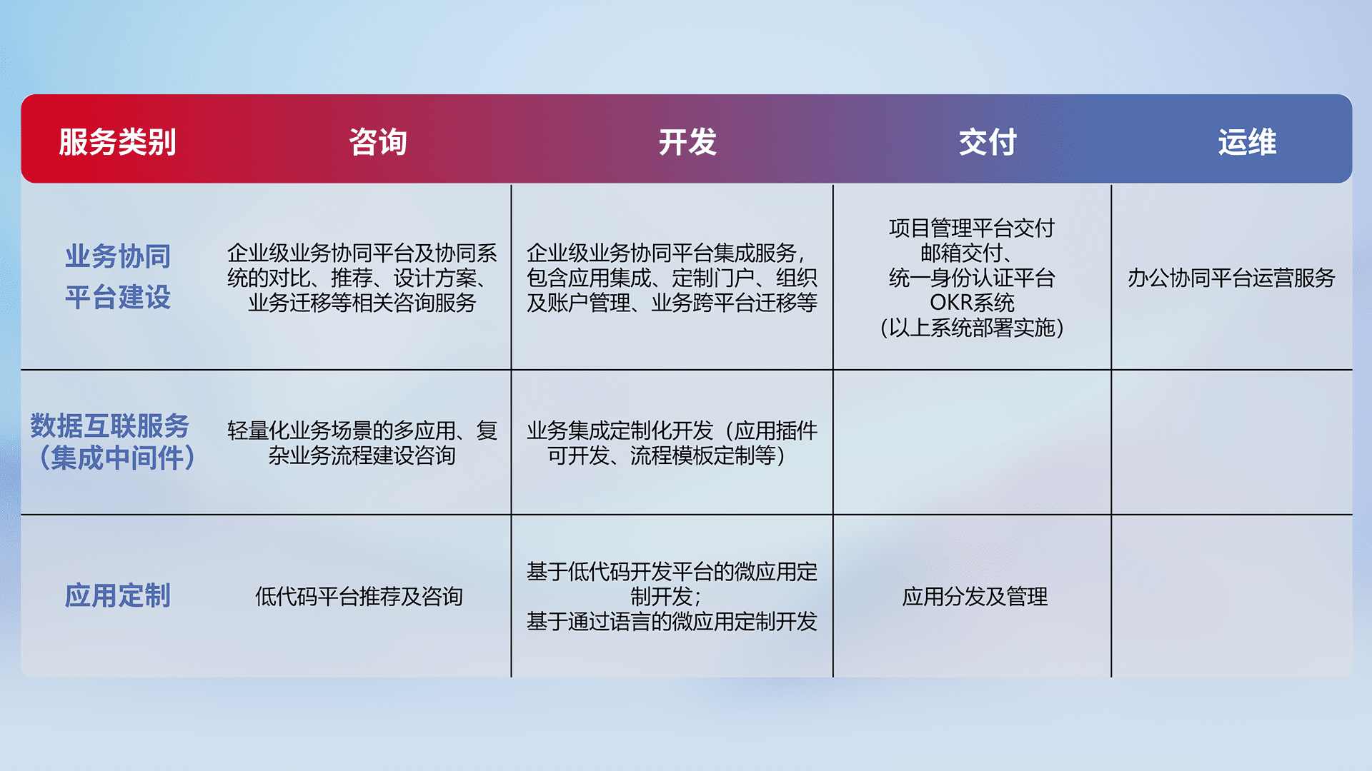 针对钉钉、、企微、、、IDaas等平台级产品提供产品的规划、、、方案、、、、交付、、、定制化开发等服务,,,,实现如统一协同办公、、智能客户服务、、、、混合会议管理、、、智能数据查询、、等业务场景,,,实现数字化转型。。